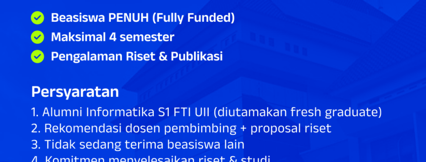 Bersama ini kami memberitahukan bahwa Program Studi Informatika Program Magister FTI UII menawarkan skema Research Assistant dengan beasiswa studi yang ditujukan bagi calon mahasiswa yang merupakan alumni Program Studi Informatika Program Sarjana FTI UII. Beasiswa yang diterima berupa biaya studi penuh (fully funded) selama maksimal 4 (empat) semester. Syarat bagi pendaftar Research Assistant sebagai berikut: