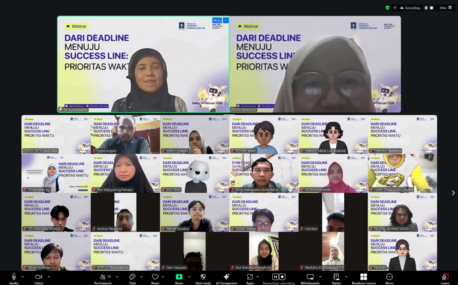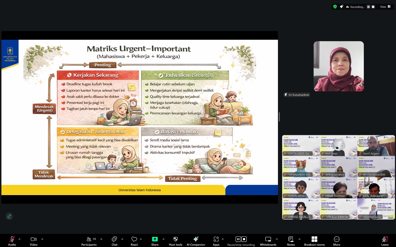 Deadline. Kata yang mungkin paling tidak disukai namun paling familiar di telinga mahasiswa, dosen, bahkan profesional. Rasa panik saat deadline mendekat, begadang untuk mengejar tenggat waktu, atau stres karena tugas menumpuk—semuanya menjadi pengalaman yang hampir universal. Menyadari tantangan ini, Program Studi Informatika Pendidikan Jarak Jauh (PJJ) Universitas Islam Indonesia menyelenggarakan webinar bertajuk “Dari Deadline menuju Success Line: Prioritas Waktu” yang menghadirkan Prof. Dr. Sri Kusumadewi, S.Si, M.T. sebagai narasumber. Webinar yang berlangsung pada Sabtu, 14 Februari 2026, melalui platform Zoom dan YouTube ini berhasil menarik antusiasme luar biasa dengan lebih dari 140 pendaftar dari seluruh penjuru nusantara.