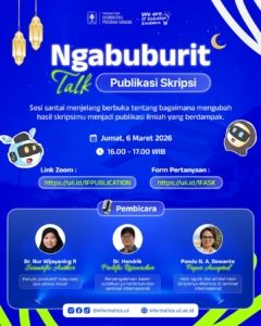 Suasana menjelang berbuka tak menghalangi semangat para mahasiswa untuk belajar. Jumat, 6 Maret 2026, Program Studi Informatika FTI UII menggelar Ngabuburit Talk bertema Publikasi Skripsi, sebuah sesi santai yang membahas cara mengubah skripsi menjadi artikel ilmiah. Dipandu oleh MC Wilda Maulida, acara yang berlangsung pukul 16.00–17.00 WIB ini menghadirkan tiga pembicara dengan latar belakang dan pengalaman publikasi yang beragam.